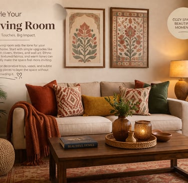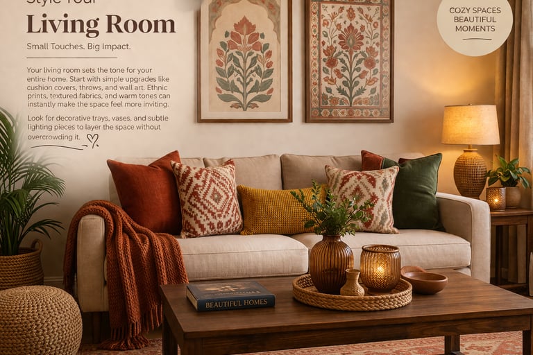 Your living room sets the tone for your entire home. Start with simple upgrades like cushion covers, throws, and wall art. Ethnic prints, textured fabrics, and warm tones can instantly make the space feel more inviting. Look for decorative trays, vases, and subtle lighting pieces to layer the space without overcrowding it.