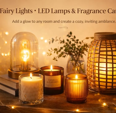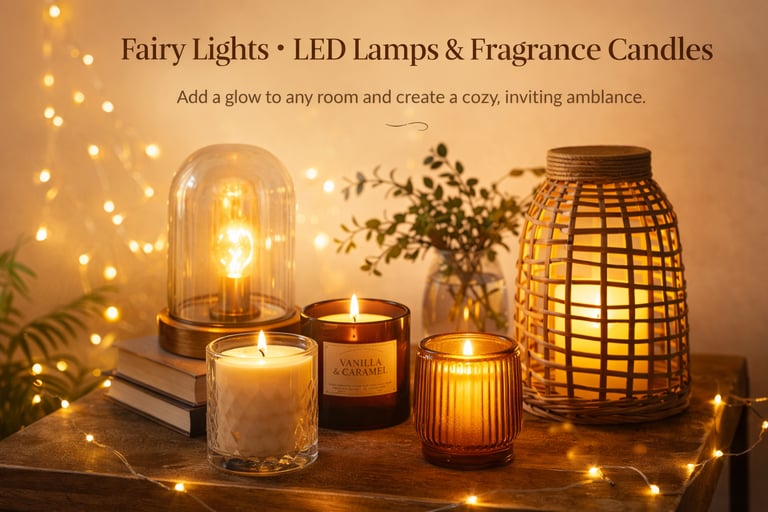 Lighting plays a huge role in creating ambiance. Online stores offers a great range of fairy lights, LED lamps, and fragrance candles that can transform your home instantly. Choose warm lighting for a cozy feel and experiment with candle arrangements for a soft, elegant glow.