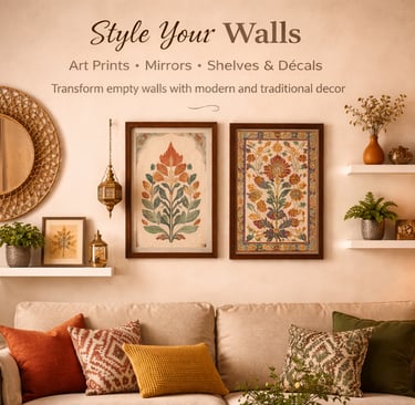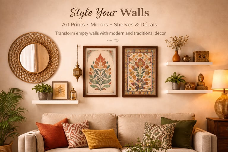 Empty walls are full of potential. Choose from framed art, mirrors, wall shelves, or decals to reflect your personality. Mixing modern and traditional elements works especially well in Indian homes.