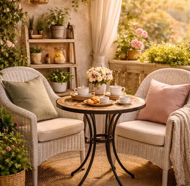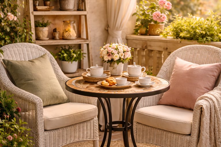 Turn your veranda into a personal retreat by setting up a small tea or coffee corner. A compact table with two chairs, a tray for serving, and a few decorative accents can make mornings and evenings feel special. Add a small shelf or tray setup for cups, books, or candles.