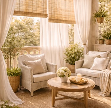 To add privacy and softness, use light curtains or bamboo blinds. Sheer curtains create a breezy, elegant look, while bamboo blinds give a more earthy, tropical feel. They also help control sunlight and make the space usable throughout the day.